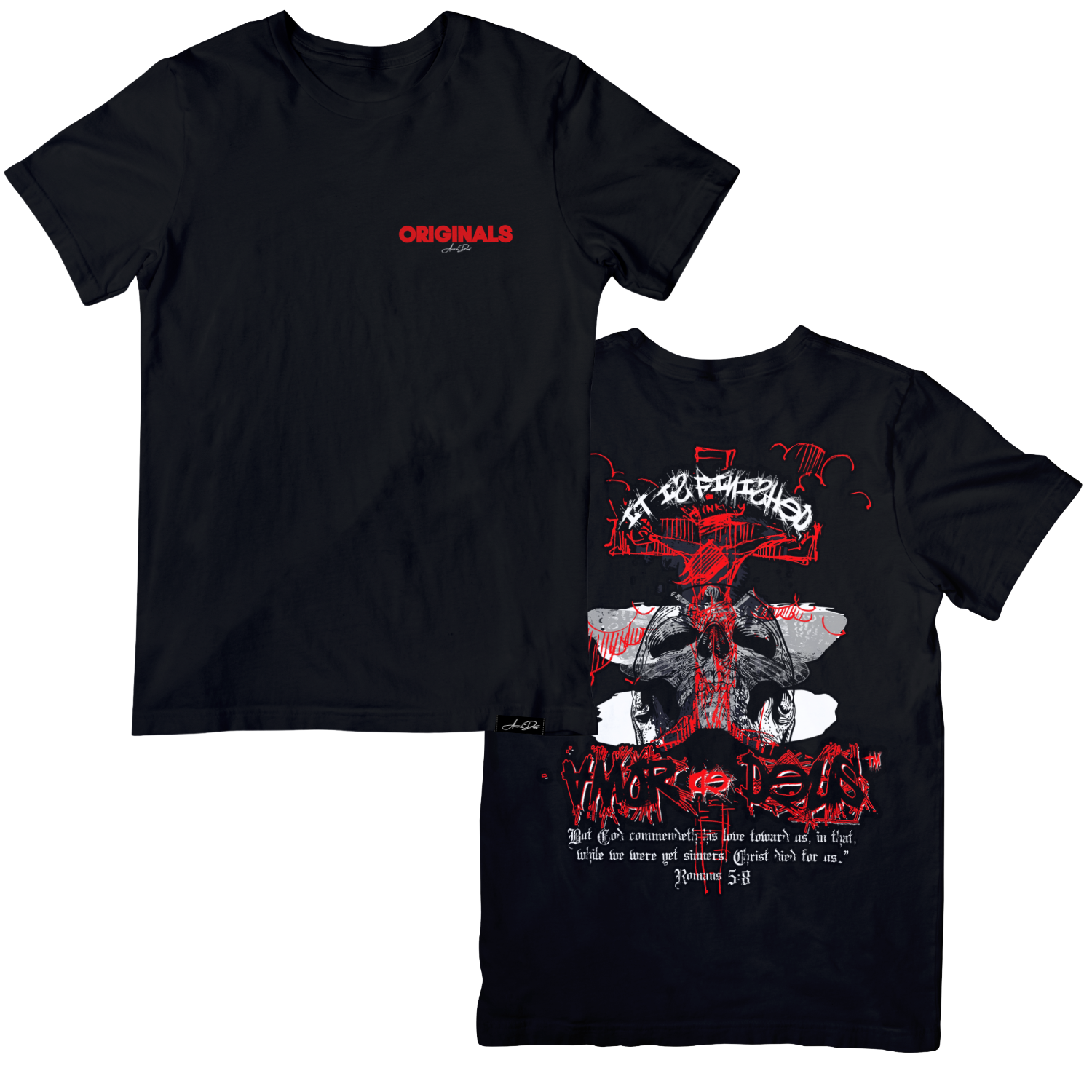 It Is Finished. Christ defeated death on the cross. Featuring ORIGINALS Branding on the Left Chest and Bold imagery on the back. Heavyweight, Streetwear Styling.